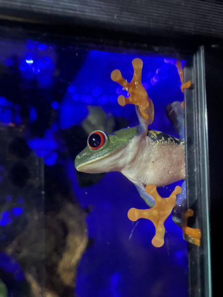普段は黒目が小さく見えますが、暗くなると瞳孔が開くのできゅるんとしたかえるの目を見る事が出来ます!